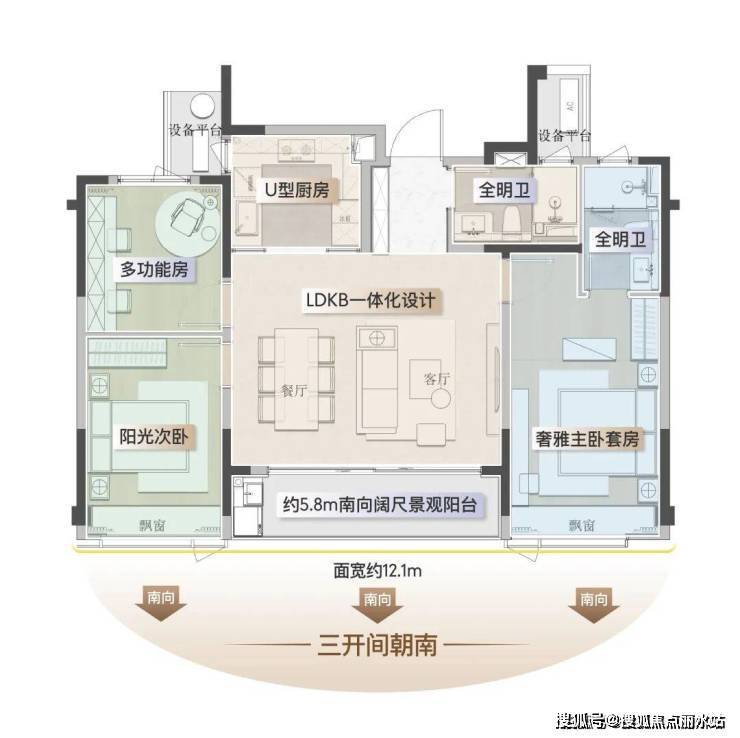 建面约115㎡经典户型,爆款上新:该户型以“三开间朝南+大尺度横厅”重构空间格局。约27㎡餐客厅与约5.8米观景阳台无缝串联,形成“社交—景观—生活”三重动线,配合约12.1米南向面宽实现“阳光平权”;约3米层高搭配弧形吊顶与全屋智能家居系统,玄关柜及部分收纳柜交付即享,北次卧可灵活改造为书房或亲子区,满足年轻家庭成长需求。