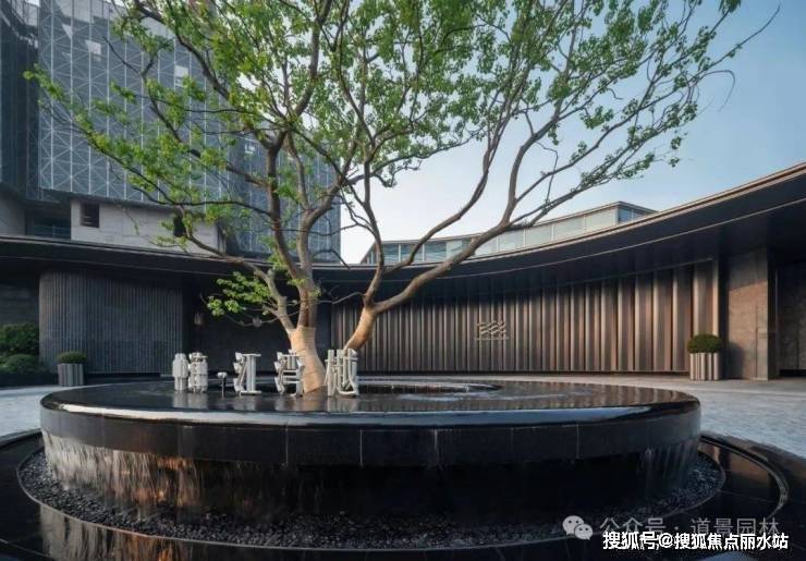 特选造型——乌桕,点缀于中央水盘之上,视觉上聚焦了整个沿街界面,背景是 “浮光跃金”主题金色弧形墙面。微风轻拂水面、阳光洒落、水波潋滟,璀璨金色光芒熠熠生辉,绿色和金色的碰撞,稳重却又富有活力。