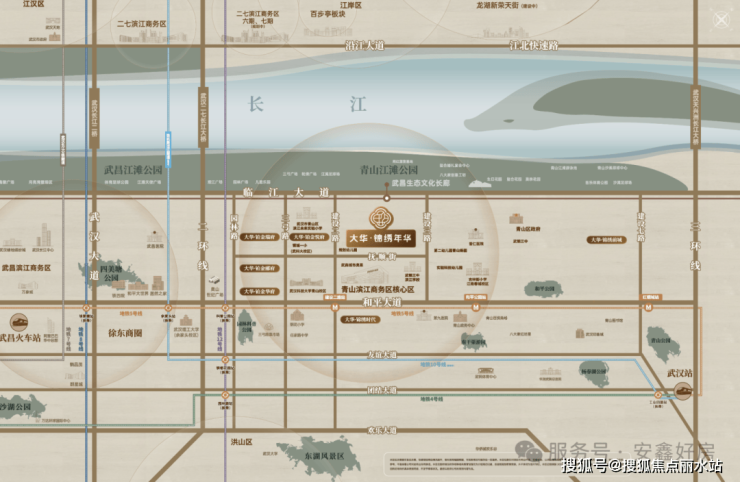 自驾:项目周边横向有临江大道,和平大道,友谊大道,团结大道横贯武昌核心,可快速连通二环线、三环线等城市环线;纵向有三纵二隧长江二桥、二七长江大桥、天兴洲长江大桥,长江隧道和长江公铁隧道,通达全城。