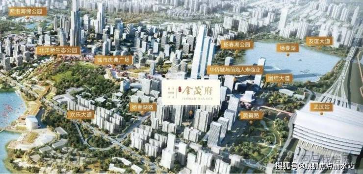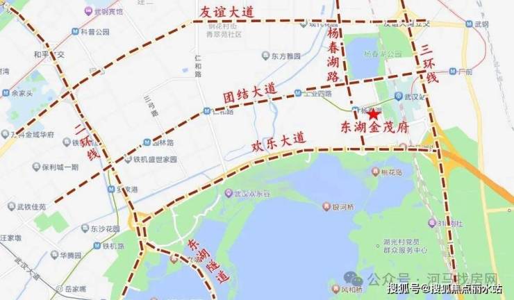 东湖金茂府位于杨春湖路以东,和谐路以北,武汉火车站以西,大区位上属于杨春湖高铁商务区,行政划分属于洪山区,距离二环线4.2公里,属于三环内。