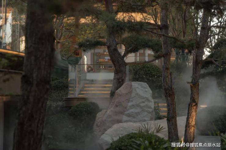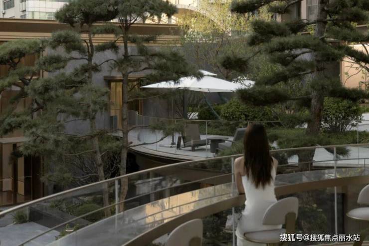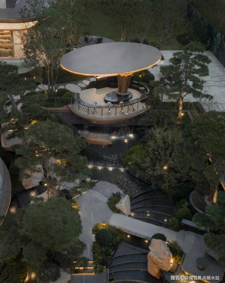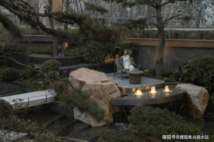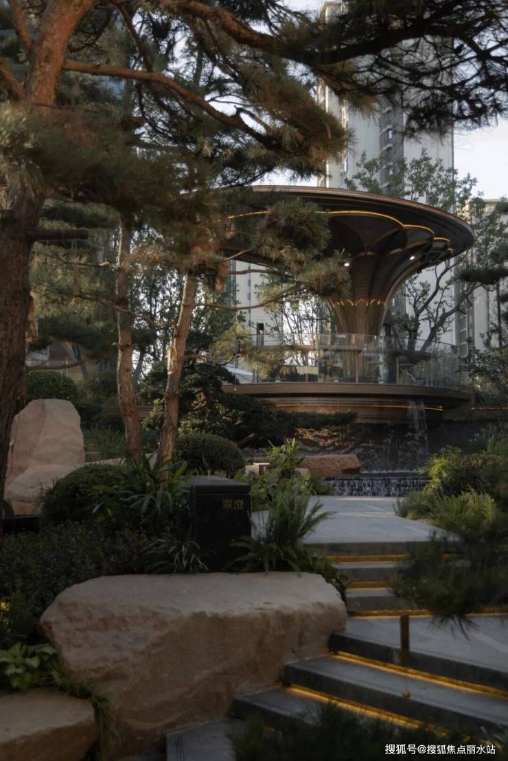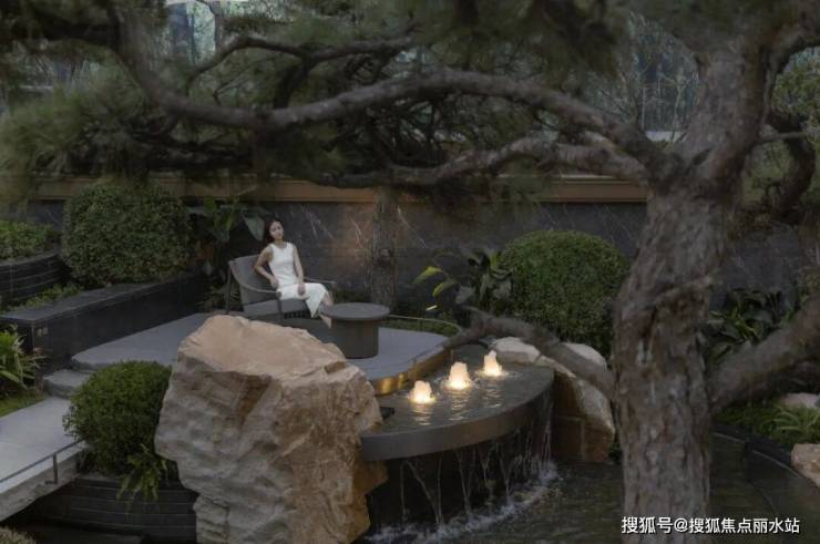 拾阶探幽,松枝垂探,俯仰叠水层阶。引山为屏,活水为脉,方寸间气象万千。几何光影映照中庭,古意今韵,共构沉浸新境。