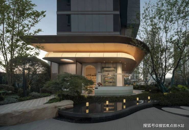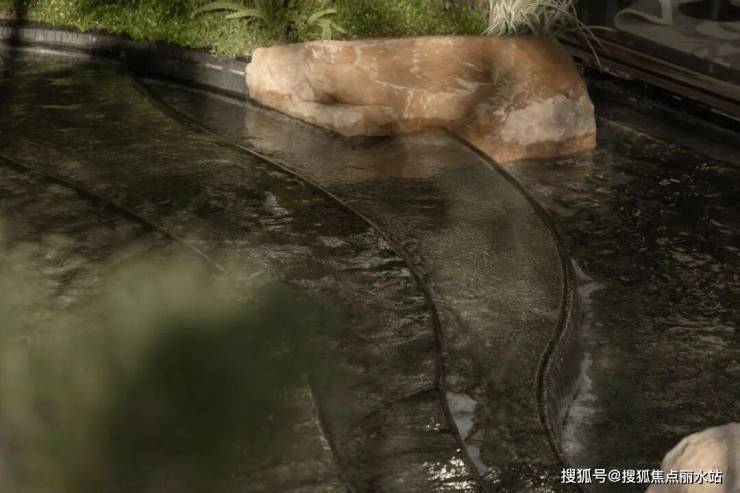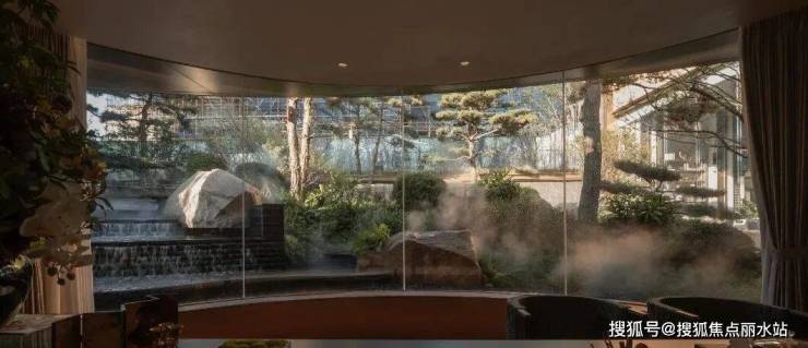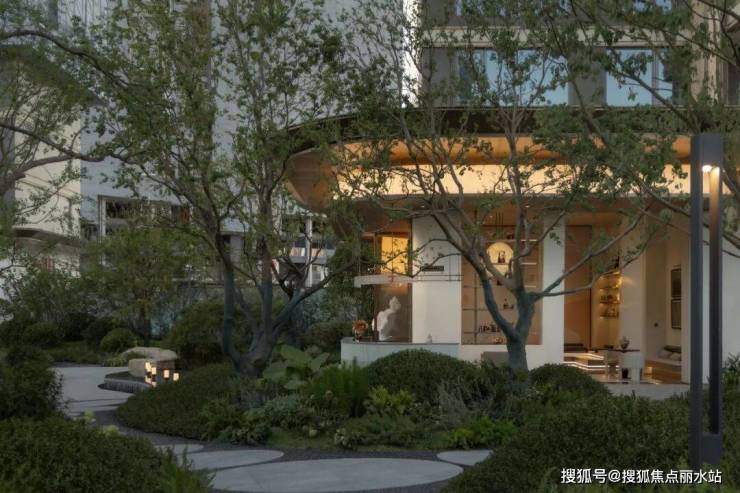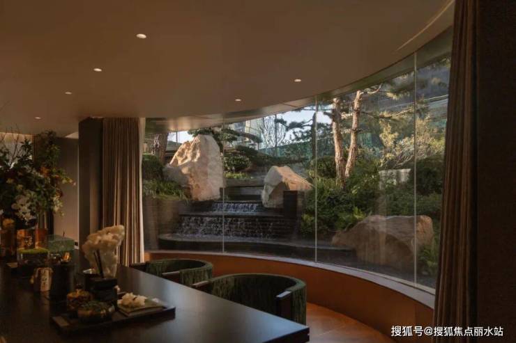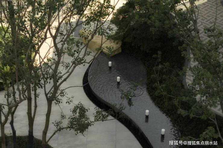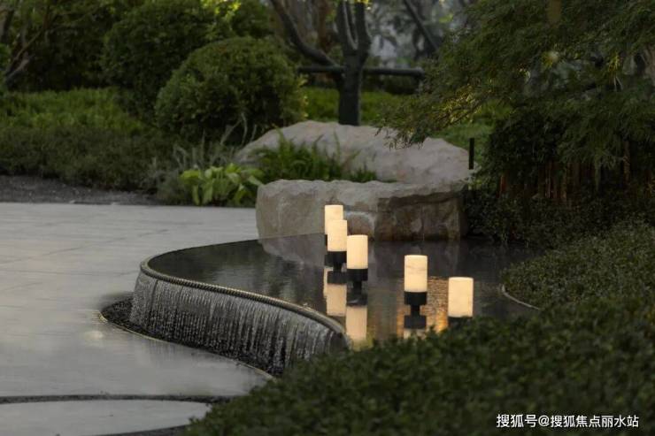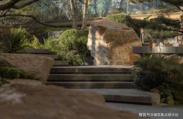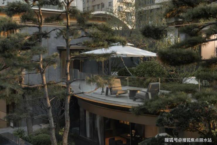 拾阶探幽,松枝垂探,俯仰叠水层阶。引山为屏,活水为脉,方寸间气象万千。几何光影映照中庭,古意今韵,共构沉浸新境。