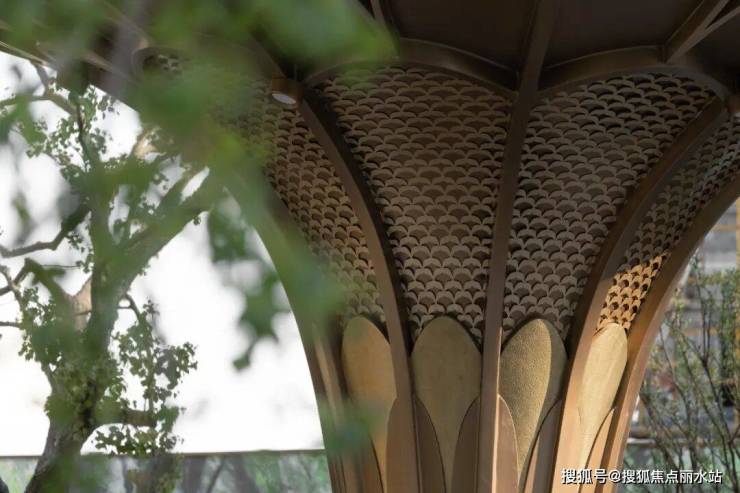 玉树鎏金亭部分发光图案采用定制符号燕子的图案,整个面层的图案肌理做了不同的层次,由下往上渐变散开的效果,成为项目超级符号。