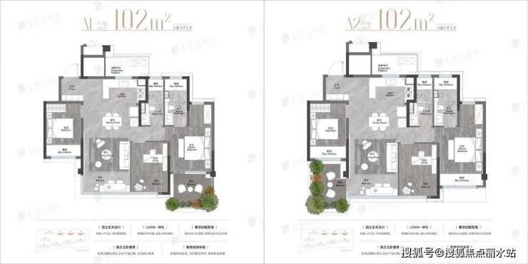 这虽然只是一个102㎡的户型,但整体空间感已经达到了传统的120㎡户型。独立玄关设计更有私密性。南向面宽达到约12.2米,满足南京人的朝南情结。