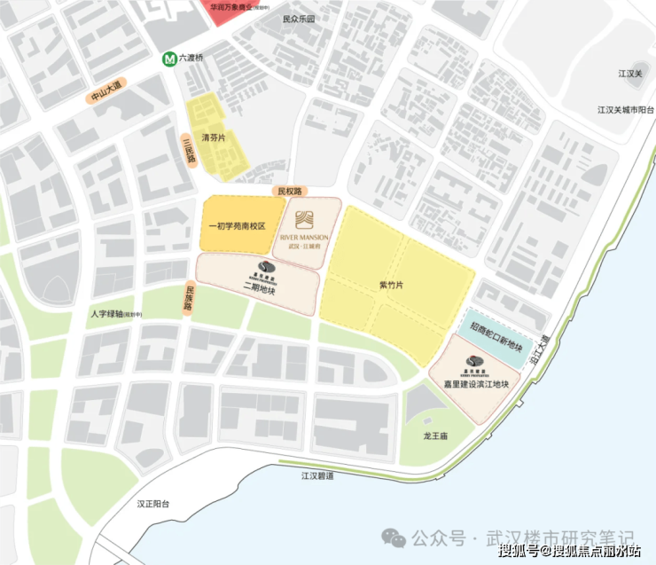 区位来看,这两个项目处于武汉内环,长江与汉江交汇处。西边是汉口起源点龙王庙,东边是华中第一步行街江汉路,与南岸嘴、长江大桥黄鹤楼隔江相望,其地段价值毋庸置疑。