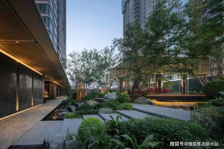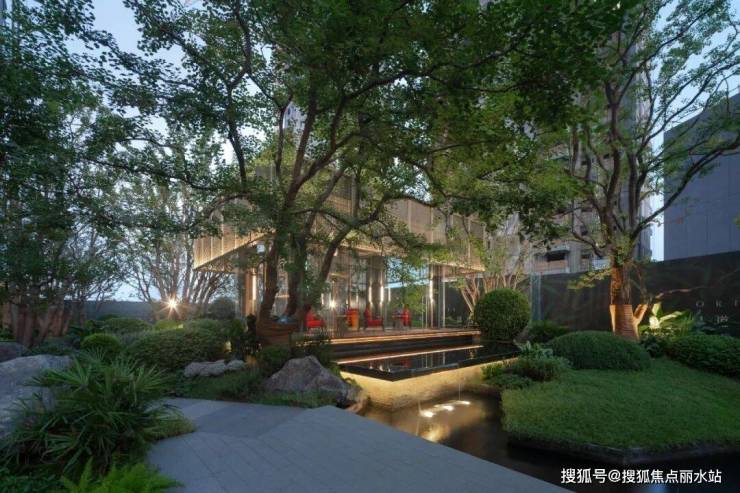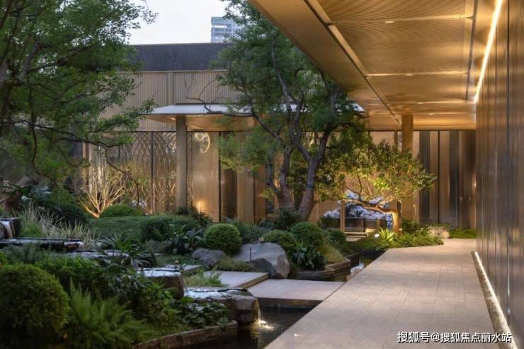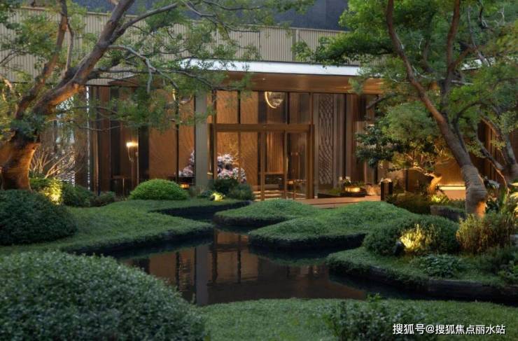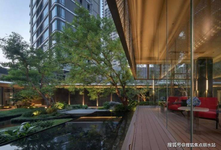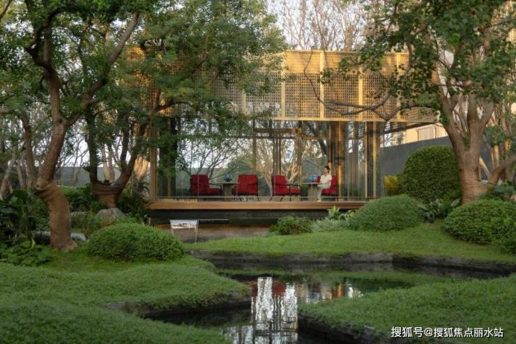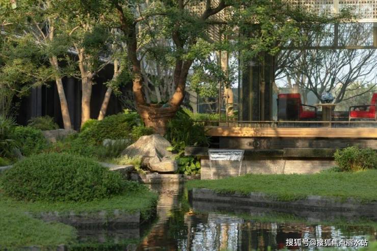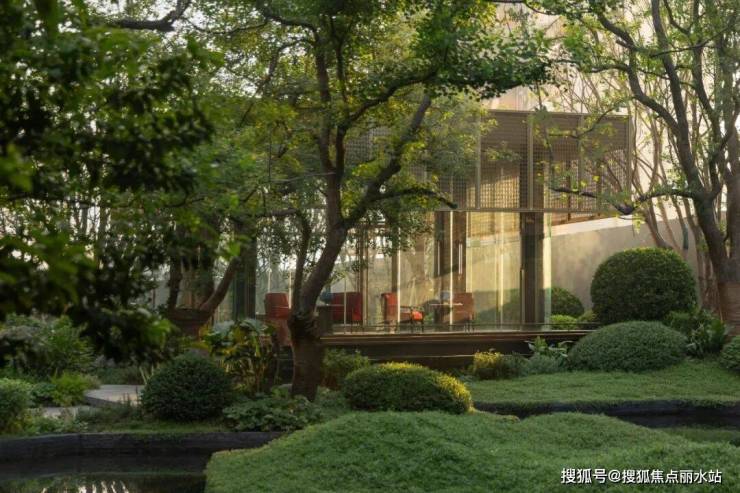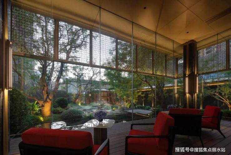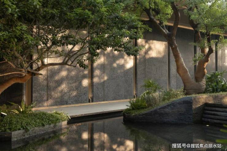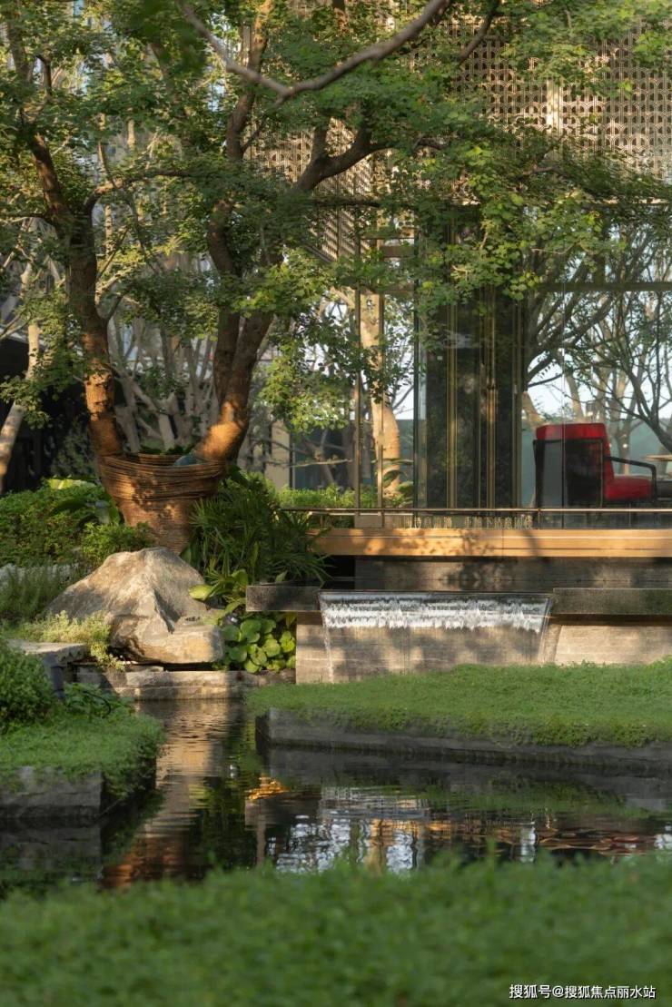 步出大堂的刹那,时空悄然转换。连廊化作天然画框,将庭院盛景以中国画卷的徐徐叙事方式渐次铺陈——景石沉波,水声自成韵律;水面倒映天光,勾勒出动静相宜的生态画卷。通透的玻璃界面模糊了建筑与自然的边界,横向延展的透明体量轻盈悬浮于水岸,与潺潺流水相映成趣,在当代语境中重新演绎了赖特流水别墅的自然意趣。