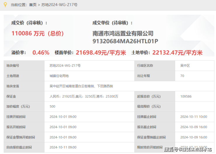 该地块(苏地2024-WG-Z17号)是南通市鸿远置业(南通海门国资背景)以总价11.01亿竞得,楼面价:21698.49元/平,溢价率0.46%。