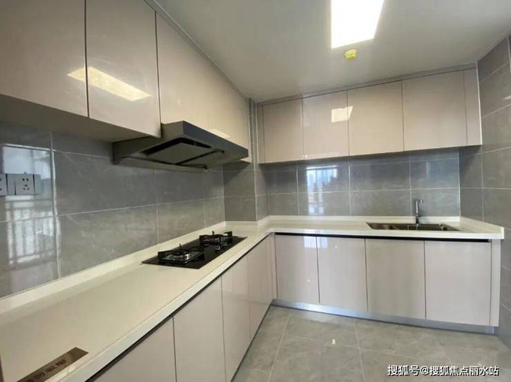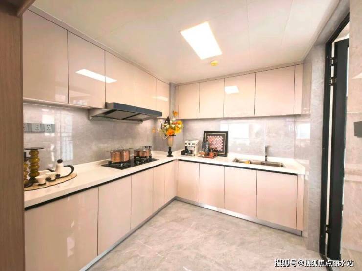 户型做到了3面宽朝南,功能布局非常实用,独立玄关区,隐形又美观;餐厅+厨房动线紧凑,L型橱柜布局,水槽设置在窗边,光线明亮,洗切炒动线非常流畅。