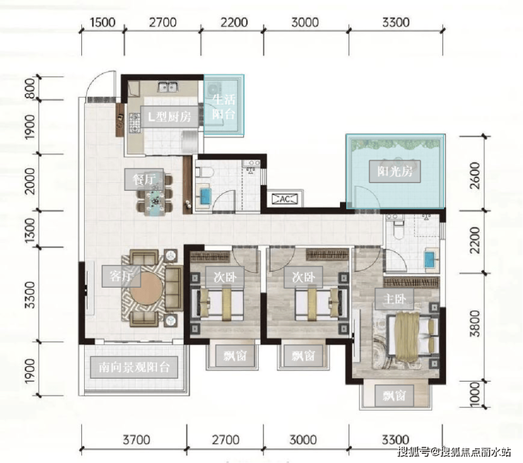 另外,该户型拓展空间大,灵活改造性强。每个房间都配备飘窗。除了客厅的景观阳台,就连厨房也有个生活阳台连接,洗晒一体,还可以兼做储物空间,非常实用。