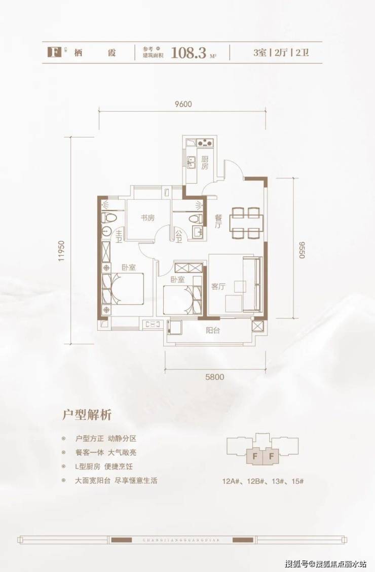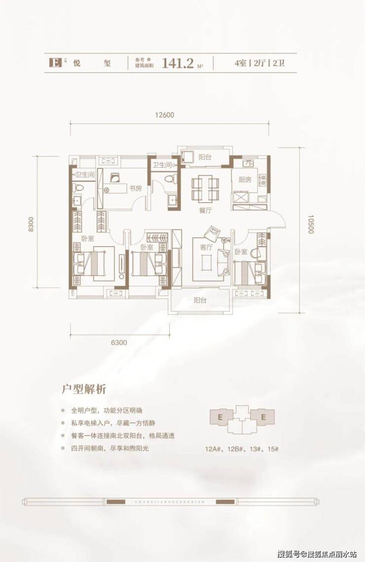 该户型分布于12A、12B号楼的中间位置,三开间朝南,北面对连廊。户型南向带有双联大阳台,整体动静分区,主卧南北贯通,整体功能性不错。