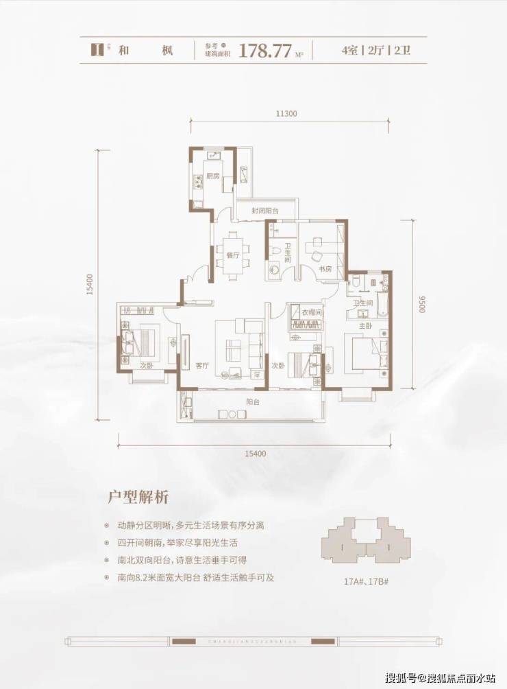 该户型分布于17B号楼中,是阔气的大平层户型,户型优势也非常明显: