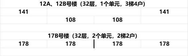 目前主推的12A、12B号楼为32层的连廊结构,三梯四户,分布户型为建面约108-141平三房四房;17B号楼则是两个单元的纯板式楼,均是两梯两户,分布户型为建面约178平的大平层。