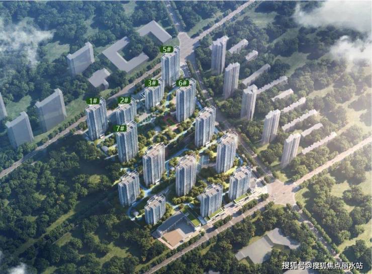一期6栋楼,二期改规划后是9栋楼,合计15栋楼;一期1/5号楼为33层、2/3号楼为21层、6/7号楼为34层,均为2梯四户,中间连廊链接。