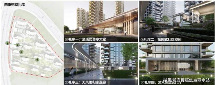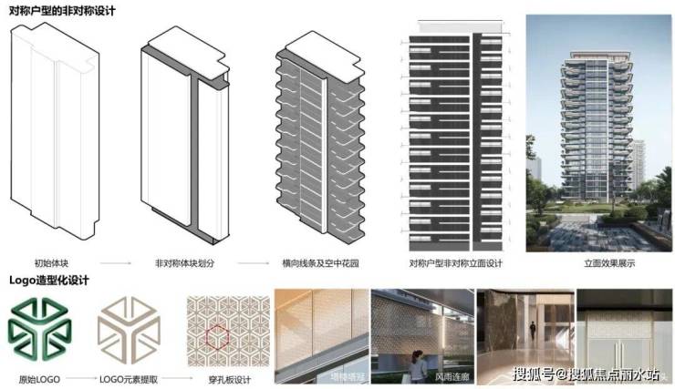 项目通过现代设计语言,赋予建筑立面灵动多变的视觉体验。对称户型采用非对称创新设计,引入四代花园上下错动的手法,形成错落有致的立面效果,开创市场先河。小区入口的大门设计采用“星空顶棚”和“水晶立方”主题,增强入口的昭示性,彰显社区的品质感和独特性。此外,设计将品牌符号巧妙融入多个建筑细部,包括单元大堂、住宅塔冠、风雨连廊、室内标识和景观铺地等,匠心营造细节,强化社区文化氛围和品牌特征。在此基础上,通过适量运用金属线条进行点缀,在严格控制造价的前提下实现了高品质、精致的视觉效果,彰显设计的巧思与品位。
