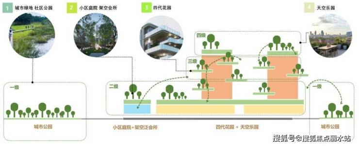 住区景观设计采用四级绿化体系,自下而上渗透到整个住区中,包含与城市绿地渗透融合的社区公园、住宅首层的社区庭院、楼栋间的四代花园和顶层的天空花园。四个层次的绿化结合功能布局、景观植被、充足的日照和多样化丰富的住区空间,共同构建了住区的整体面貌,展现了每一个组团空间的绿色焕新。