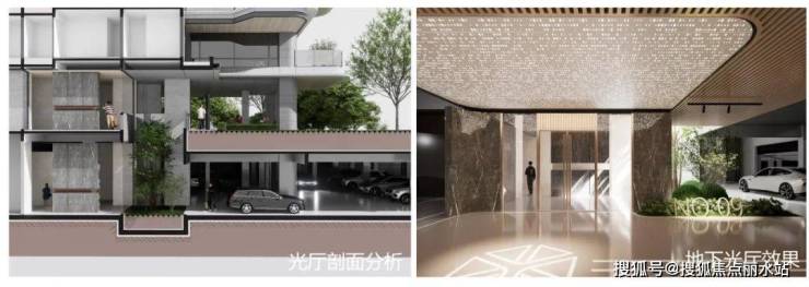 为了营造舒适的人居环境,设计针对归家、入户等多个维度的细节进行了优化。在单元入口空间采用“单元光厅”,结合架空层内的下沉庭院,引入自然光线和空气流通,大幅提升地下大堂的采光和通风效果,同时减少地库机械通风设备的使用,节能环保且归家体验更佳。