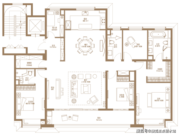 五开间朝南,独立入户门厅,拐角玄关,三进式餐厨空间,双套卧,步入式衣帽间等等,大面积户型该有的优点在这里是一应俱全。但该户型最大的亮点,并非是将优点汇聚,而是在此基础之上无限放大的优势。