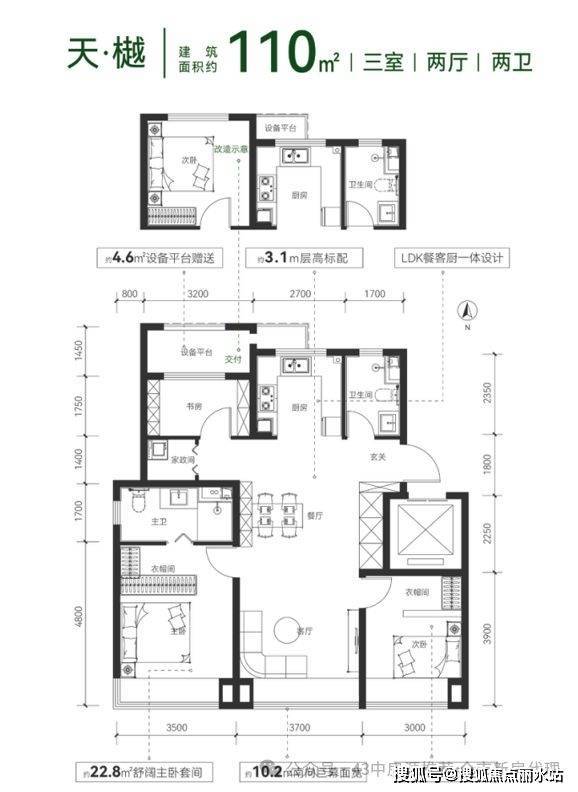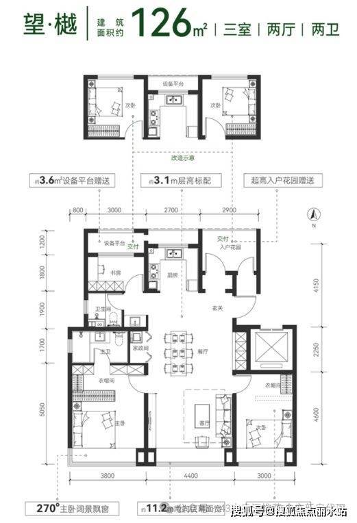 云璟·朗境:标准四叶草四卧室布局,独立家政间、衣帽间、入户玄关收纳客厅。