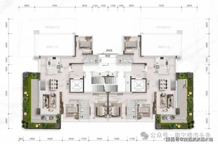 但其注重的是“立体”,在保证足够的房间数量,客厅尺度下,在立体空间与视野上做享受,类似于别墅的立体层次。