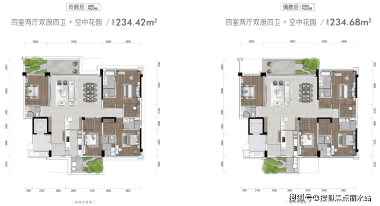 234平方米顶豪户型,一梯一户全板式设计,四房两厅双厨四卫。同样是3.3米层高,6.6米挑高空中花园,全明电梯入户,内部少承重柱;8.4米开间阔景方厅直连挑高阳台,总面积高达70平米。
