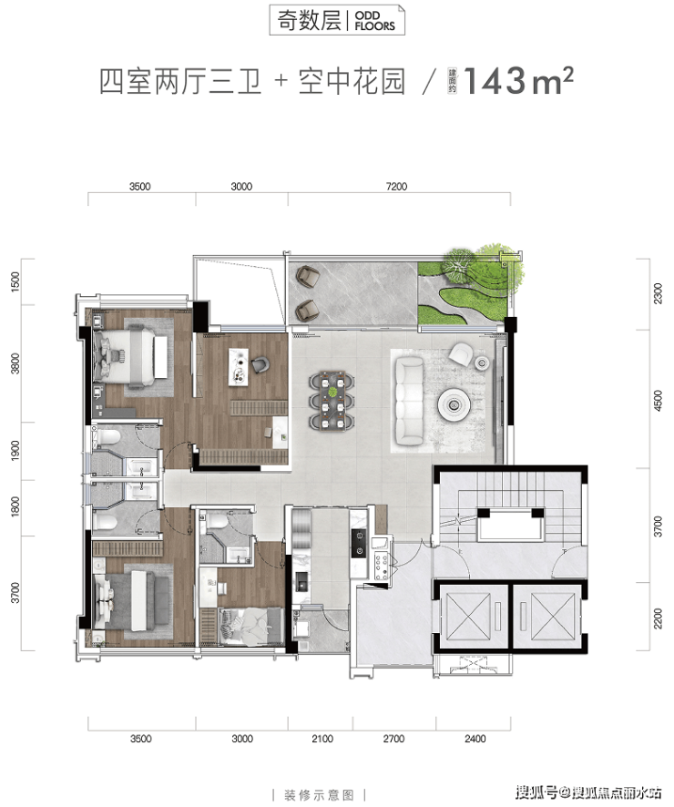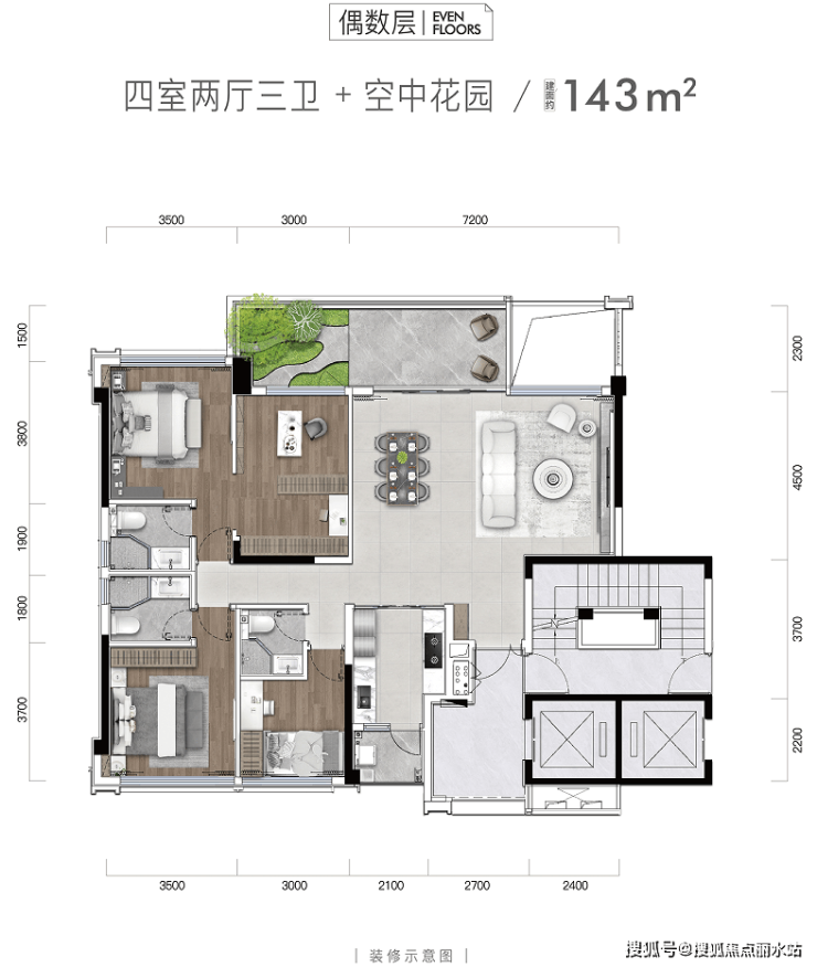 143平方米的户型,一梯一户全板式设计,四房三卫,户型结构方正,动静分区,南北通透,全屋除了公卫有剪力墙外,其余承重墙都在外围,为业主留足了个性化改造空间。