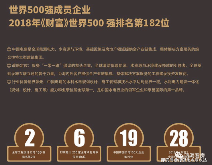 中国电力建设集团,国家重点工程三峡大坝的缔造者,已连续6年跻身世界500强,2019年世界500强排名第161位,ENR全球设计榜单排名第一位。