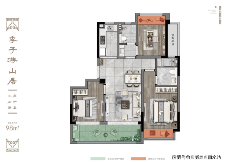 建面约98㎡三房两厅两卫:南向双联阳台,南北通透;客卫干湿分离;主卧套房,带转角飘窗。