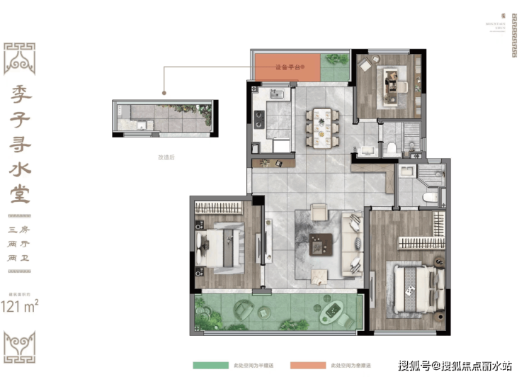 建面约121㎡三房两厅两卫:放大版的98㎡户型,在此基础上,有两点变化。①北向设备平台可以适当改造,延伸厨房和餐厅的空间;②主卧飘窗没有了,但空间感更强了,也更加实用。