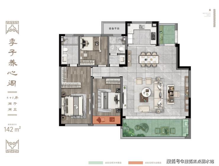 建面约142㎡三房两厅两卫:独立入户厅;横厅设计,餐客大宽厅;LDKG一体,南北通透;动静分离更彻底。