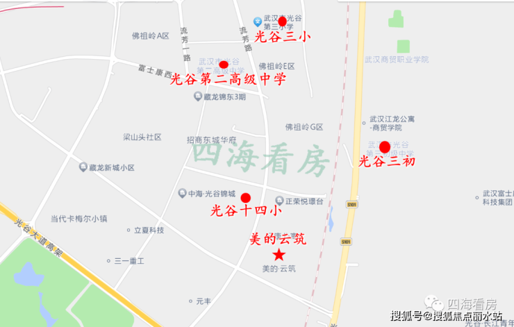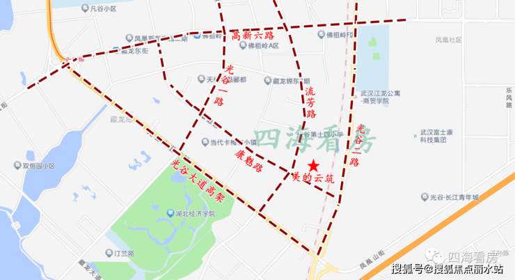 美的云筑光谷二路以西,康魅路与流芳路交汇处,楼市中属于金融港板块,行政划分属于东湖高新区。