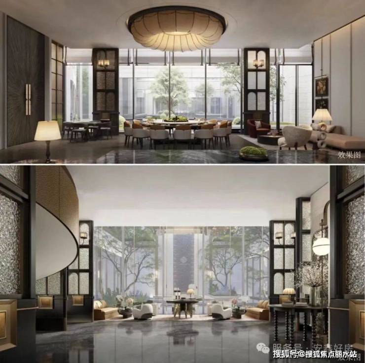 主入口打造双大门,东侧约39米、西侧约43米的超宽尺度,高度约8米,臻选进口木纹石、蓝翡翠石、透光云石等奢石,结合十余项复杂精工技艺,构建当代豪宅空间质感巨作。