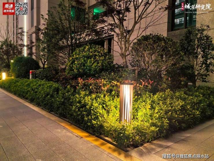 每个楼栋前的景观带里,都有精致小巧的地灯点缀其中,氛围感一步到位。