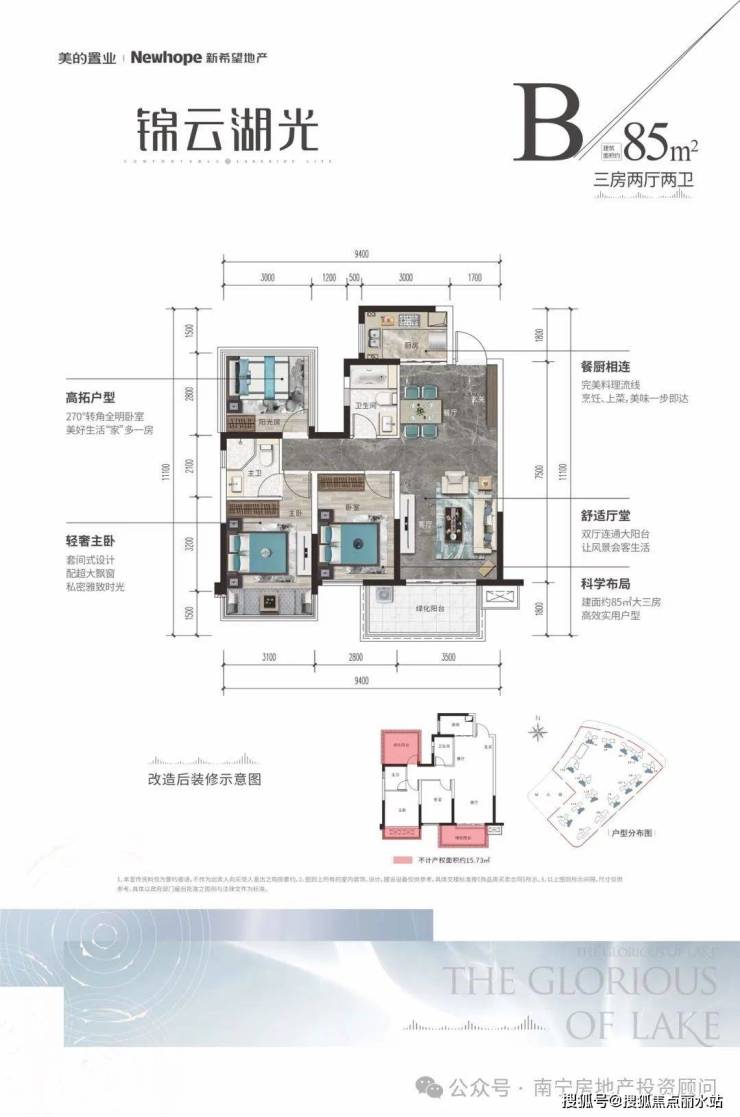 85㎡三房两厅两卫(赠送面积约15㎡)。