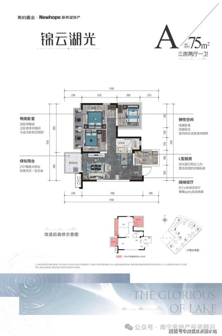 75㎡三房两厅一卫(赠送面积约15㎡)。