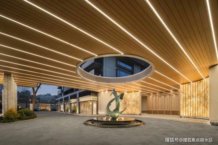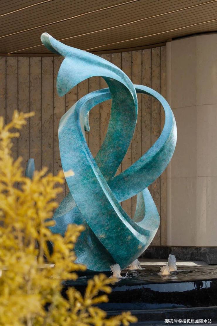 前场预留酒店环岛落客区,对标「鱼跃飞鹭」的水景雕塑矗立,基座采用乌克兰进口幻影蓝石材,镶嵌蓝色结晶,如梦似幻。
