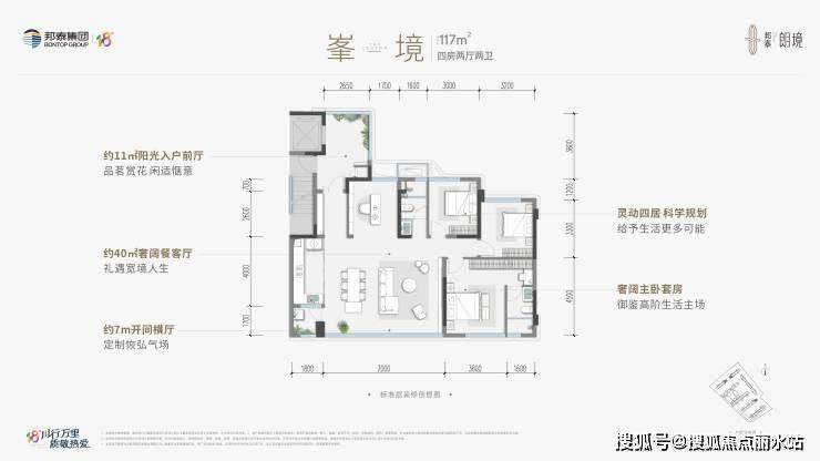 建面约135㎡ 樾境 四室两厅三卫+双套房(精装)光幕美学立面,酒店式套房主卧,双套房设计,中央社交方厅