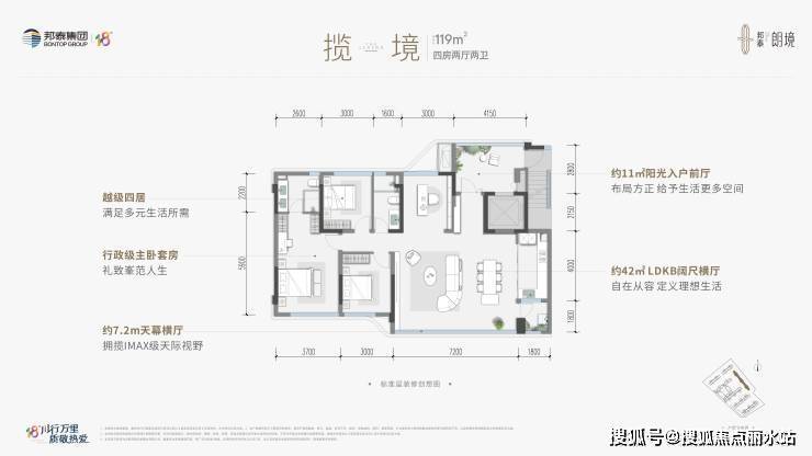 建面约119㎡ 揽境 四室两厅双卫(精装)越级四居,约7.2m天幕横厅,行政级主卧套房