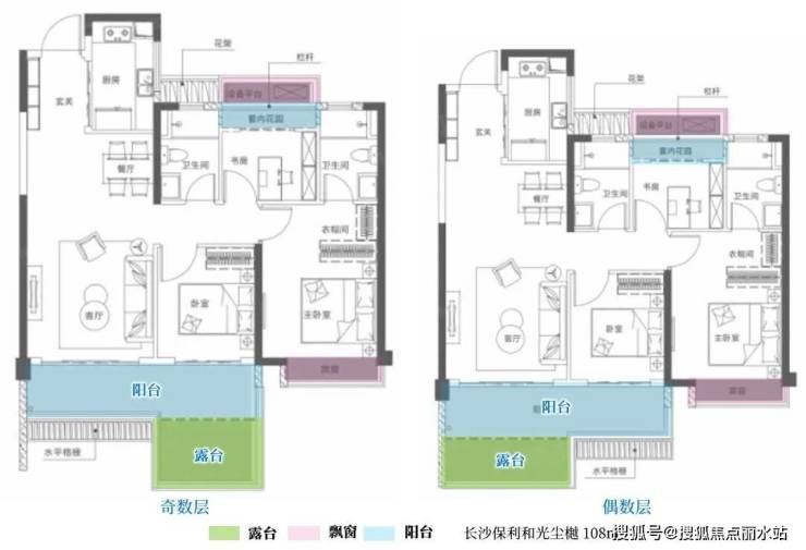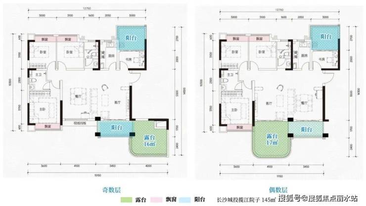 顾名思义奇偶层户型露台全部都朝南,好处就是让所有户型都拥有南向的采光视野面,真正做到了奇偶层采光视野面的平权化。例如长沙城投揽江院子145㎡户型,奇偶层户型的露台均位于客厅南侧,与景观阳台相连。