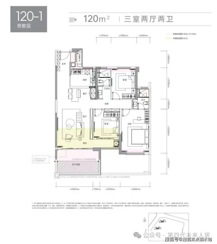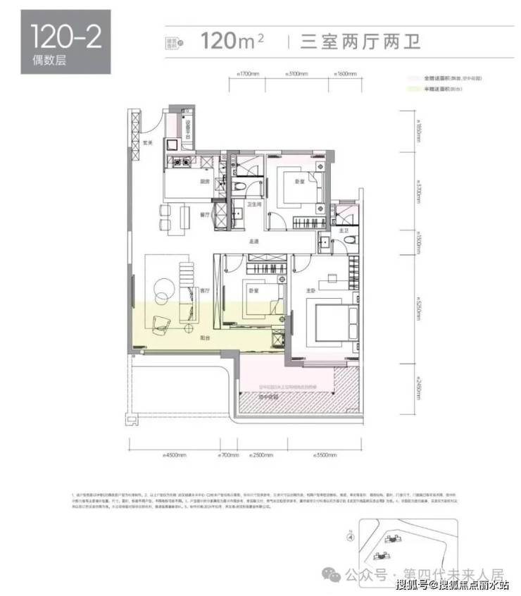此次揽境(C2 地块)中间户建面约 120㎡三房两厅两卫户型,采用奇偶楼层差异化布局,综合建筑得房率约 127%。户型三开间朝南,配备空中花园,约 4.5 米开间客厅连通约 7.7 米尺度大阳台,采光与空间感兼具。南向次卧带有拓展赠送空间,北向区域基本以飘窗形式实现面积赠送,主卧为南向套房设计,开间约 3.5 米并配置南向飘窗,进一步提升居住舒适度。(具体以项目最终数据为准)