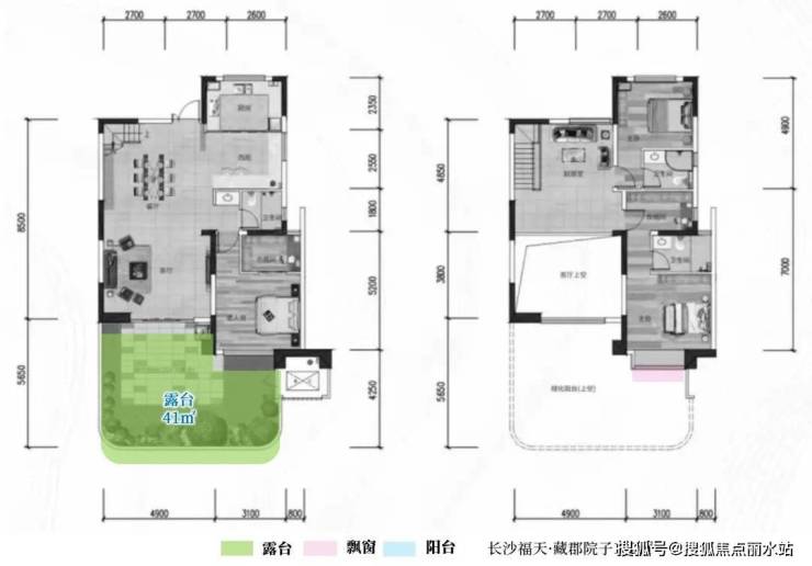 由于大平层的流行,复式产品逐渐淡出人们的视野,在第四代产品里也比较少见。例如下面长沙福田藏郡院子182㎡的复式户型,客厅挑高,4.9米宽厅外带了一个5.4米×8米尺度的超大露台。复式二层也是属于本户型的空间,所以避免了上层户型可以窥探下层露台的情况。