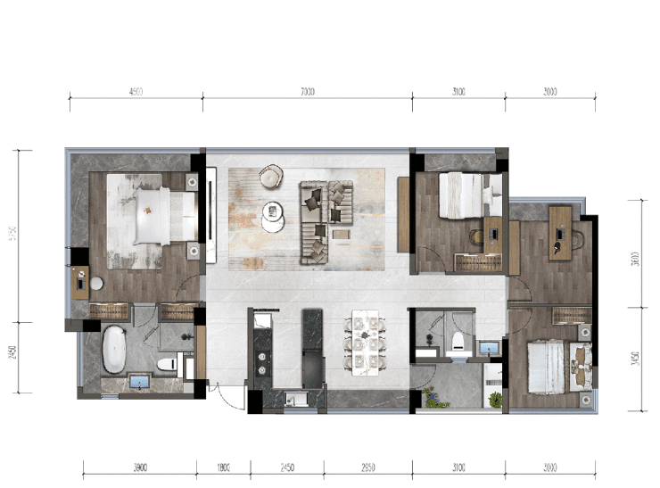 户型内部采用了动静分区的布局,6.5米的横厅尺度非常舒适。奇偶层户型露台分别位于户型南北侧,而且连接露台的位置是以阳台形式半赠送的空间,就是因为阳台空间的加持,才让客厅拥有第三厅的功能。