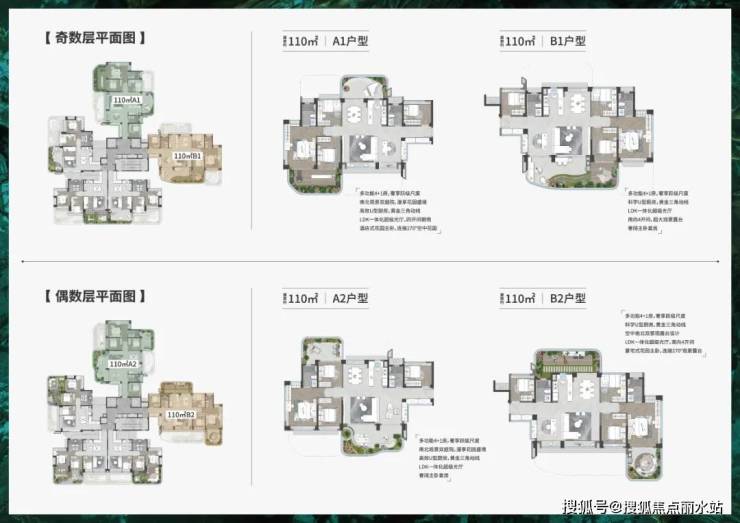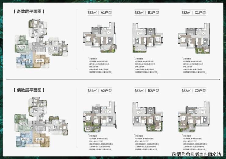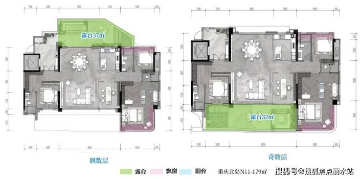 既奇偶层户型的露台分别位于户型南北两侧,传统户型的南北阳台,由南北露台代替。例如以下重庆龙湖北岛N11的179㎡的户型,奇数层的露台位于客厅南侧,并连接次卧套房,而偶数层的露台位于餐厅和厨房北侧。