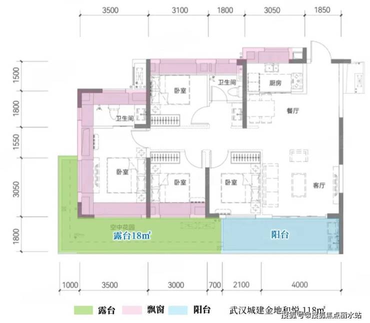 例如武汉城建金地和悦118㎡的户型,客厅外是6.1米的大阳台,进深1.8米。阳台旁边连接了同进深的露台,而且做了L型的延伸,让主卧实现了双面的景观庭院体验。但是进深仅1.8的露台相比较前面的超大露台空间来说,实用性和体验性都弱一些。