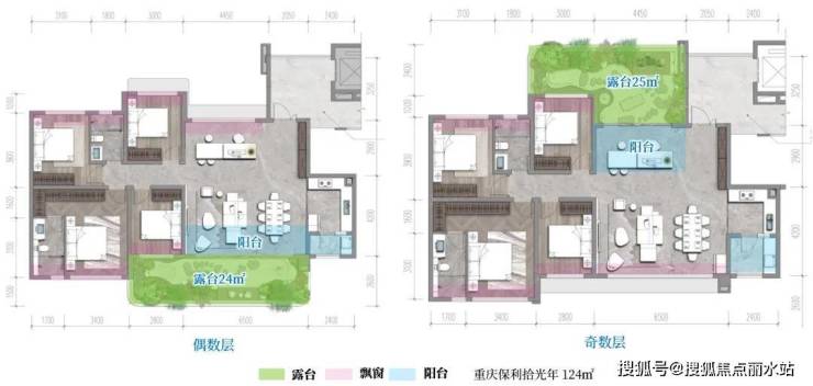为了让奇偶层户型的露台朝向和视野面更加合理,奇偶层户型分别拥有南向和侧面的露台。例如重庆国瑞学府壹号143㎡户型。