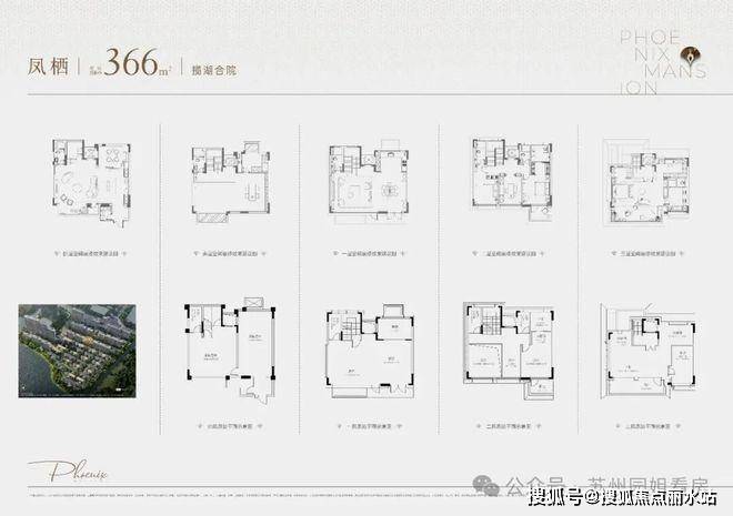 合院户型约366/440㎡,横向披檐+层层露台,首层360°洄游厅堂,高窗墙比。