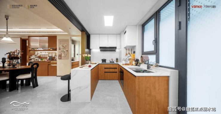 约10㎡超大厨房空间,多人同时烹饪也不会拥挤;采用蜜柚色系柜体,与整个空间遥相呼应,搭配轻奢质感台面及香槟白釉面墙砖,柔化深棕的厚重,砖面细腻如瓷,既防油烟又显轻盈;储存空间上选择地柜+吊柜组合,炊具、餐具、米油等都可轻松收纳;同时预留冰箱位置,让整个空间动线更加流畅;岛台的打造则将家的质感提升一个档次,不仅增加了存储空间,更为生活增加了无限趣味,一侧预留出深度作为休闲吧台,备餐时也可以与家人朋友闲聊;厨房连接北向拓展平台,增加实际收纳空间,可放置生活杂物,冬季亦可存储瓜果菜品等。