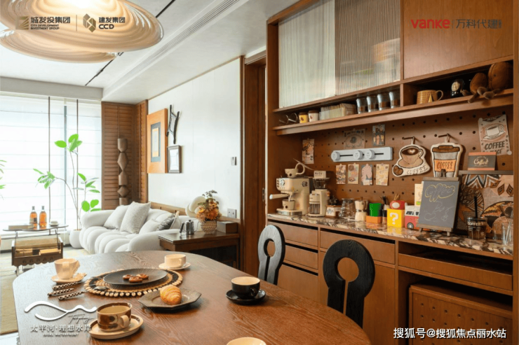 餐厅可打造一组柚色系餐边柜,以“咖啡”为主题,甜美、醇厚,跟美拉德色系最为适配,搭配精美咖啡杯及用具,非常有视觉冲击感;同时也符合现代人的生活习惯,早上一杯咖啡提神,下午一杯咖啡充能。
