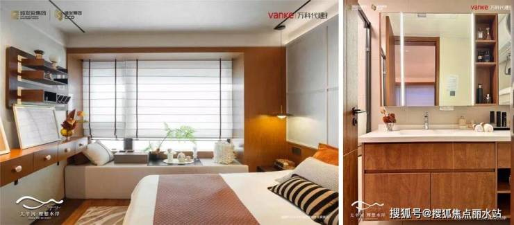 主卧配置独立卫浴间,柜体(非交付标准)通体采用柚色系,与卧室色调接续,地面铺设哑光质感的柔光瓷砖,两者相映成趣;整个空间都做了人性化设计,卫生间镜柜考虑到女主人的身高,设置了不同高度的开放格,方便取放化妆品,同时做了精细储存的分区,即方便又实用。