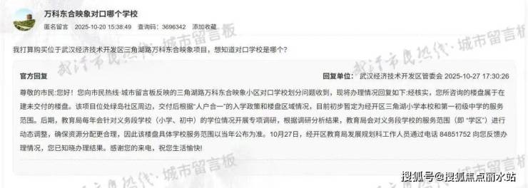 根据城市留言板回复,该项目位处绿岛社区周边,交付后根据‘人户合一’的入学政策和楼盘区域情况,目前初步暂定为经开区三角湖小学本校和第一初级中学的服务范围。