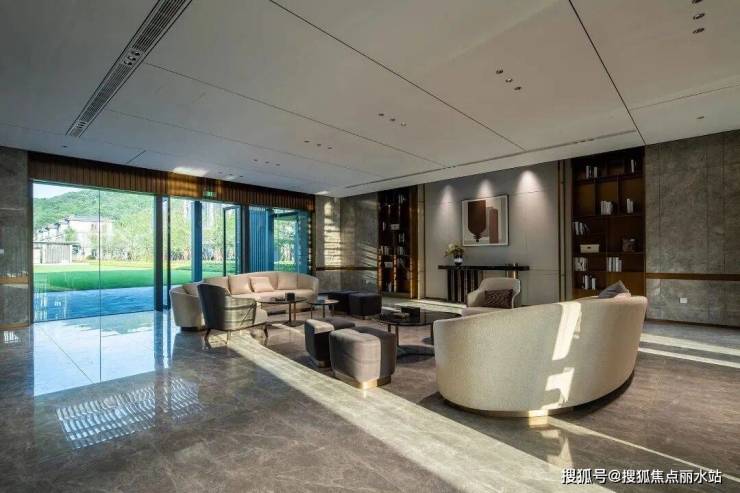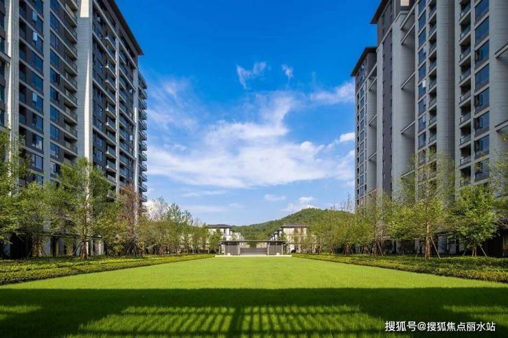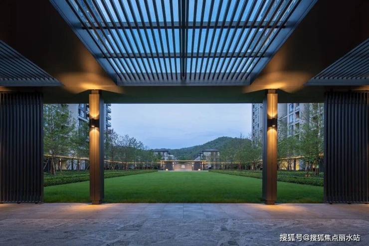 一条仪式感十足的礼序中轴,从西面一路延伸至溪山之畔,酒店式落客大堂、阳光草坪、行列树阵以及溪、山次第铺展,尊贵感和归属感油然而生。